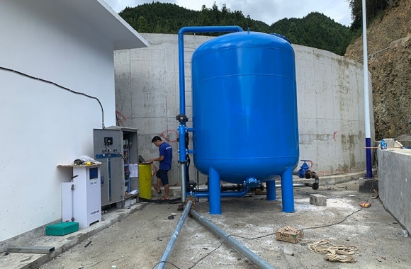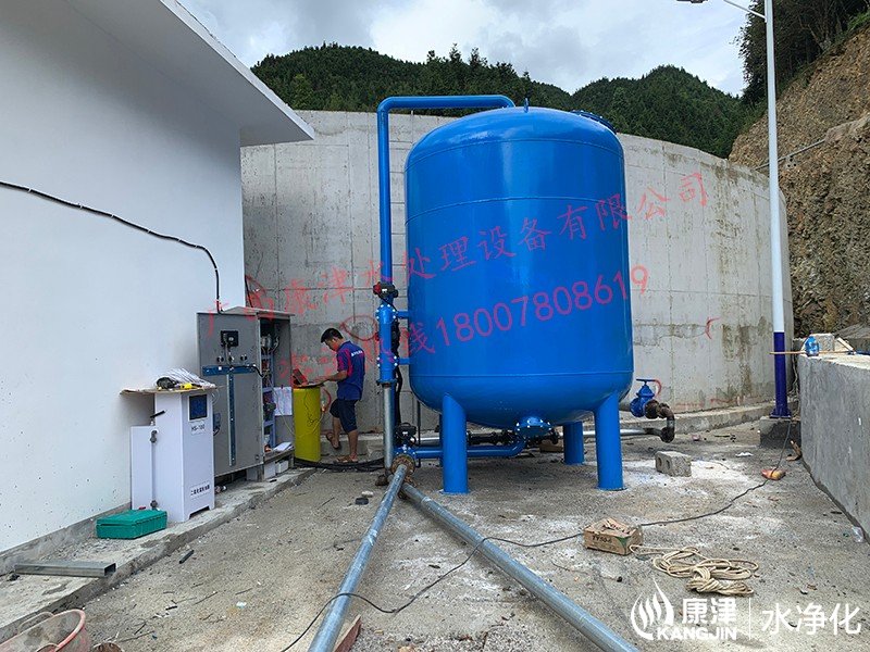 工藝流程:山泉水-絮凝投加器-石英砂過(guò)濾器-二氧化氯加藥器-用水點(diǎn)